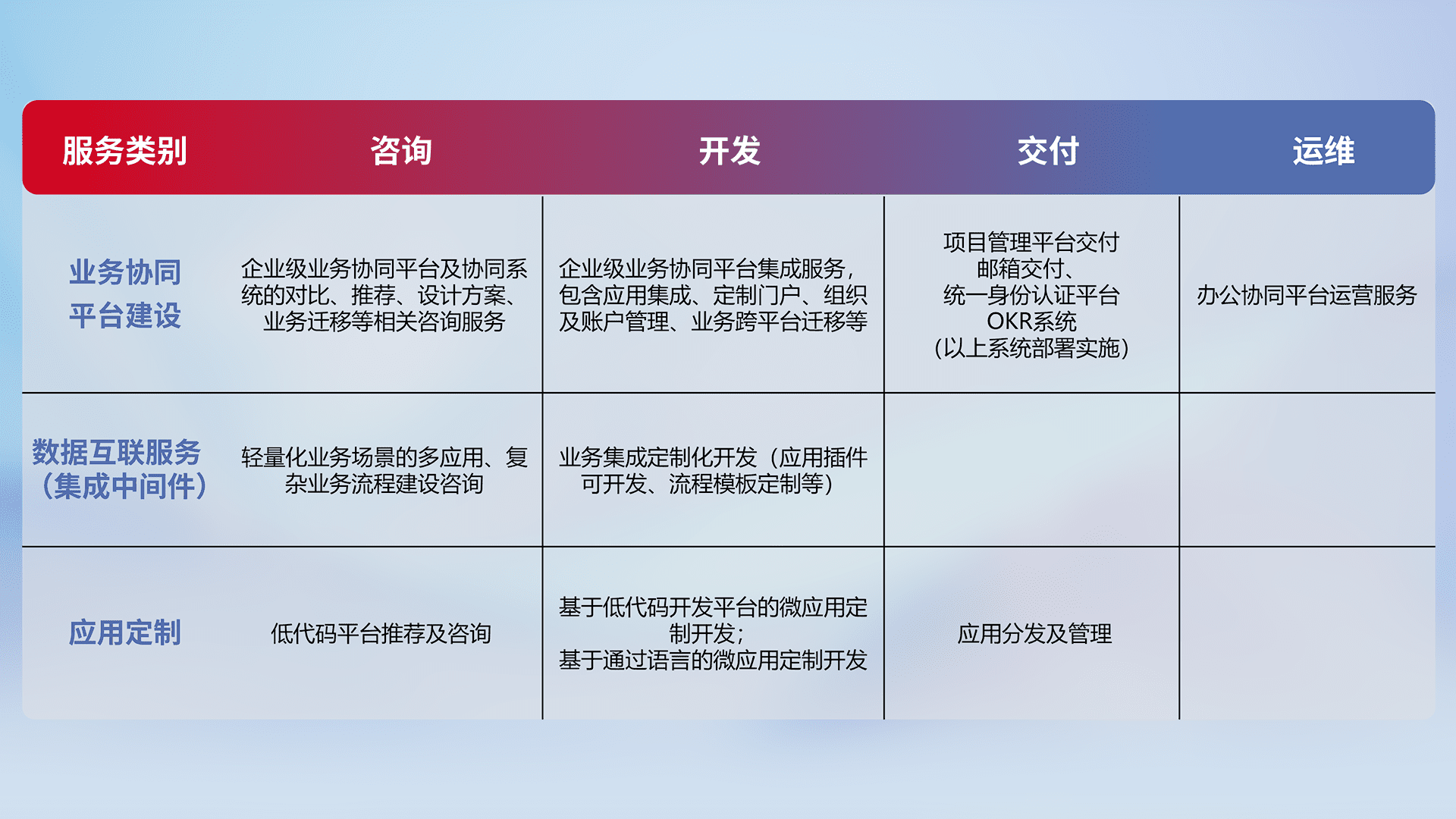 针对钉钉、、、、企微、、IDaas等平台级产品提供产品的规划、、、、方案、、交付、、定制化开发等服务,,,实现如统一协同办公、、智能客户服务、、、混合会议管理、、、智能数据查询、、等业务场景,,,实现数字化转型。。。